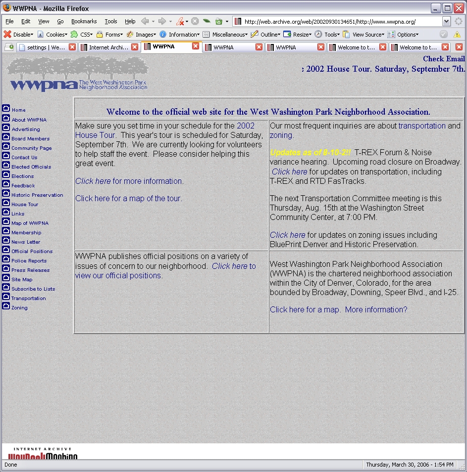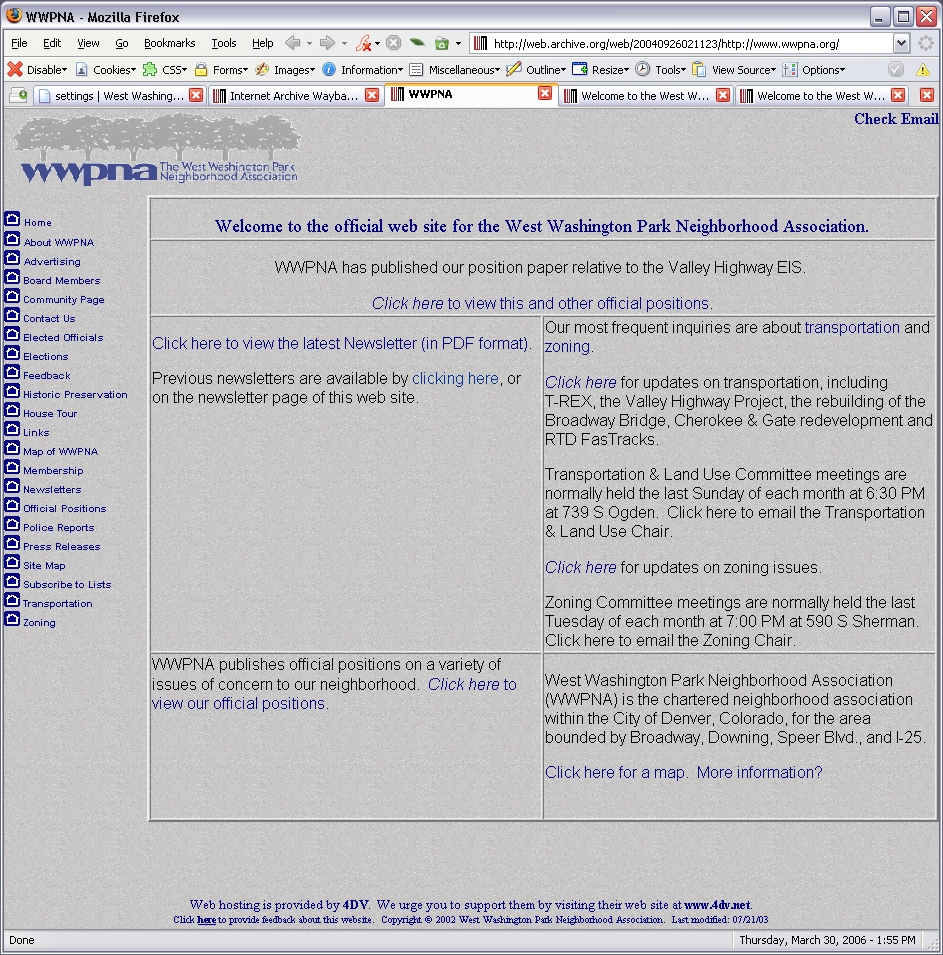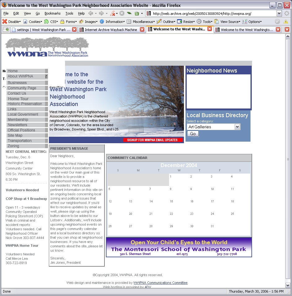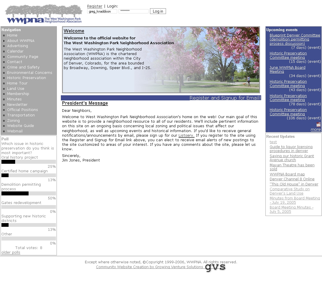 West Washington Park Neighborhood Association (WWPNA) has had several websites over the years. Early in 2006 I began discussions with their Communications team to help update their website. One consistent problem with the site was making it easy enough for board members to add their own information. The group is primarily volunteer based with varying levels of computer savvy. Our main goal was to make a site that was easy for the Board members to update. Along the way we also cleaned up some of the old content and added updated functionality like a calendar.