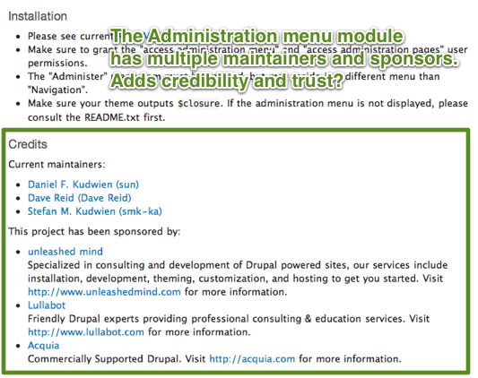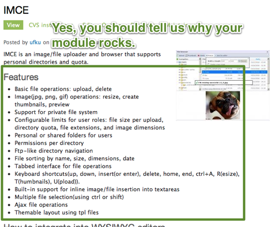 The folks that responded to my (very non-scientific) survey are all Drupal-savvy. What about the less-than-savvy? The maintainer names won't be meaningful and neither will some of the stats. The emphasis is now on making your module description more useful. Here's a few ideas...
