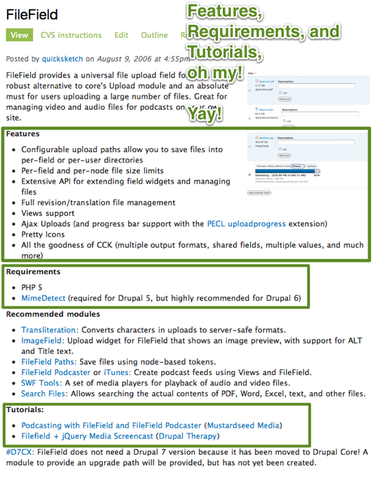 Notice that items 1-7 are provided automatically by the Drupal.org Project module. And items 9-12 are details that only the module maintainers can provide within the project's Full description field.