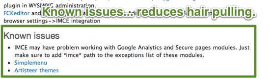 If there are conflicts, incompatibilities, extremely common bugs, or gotchas that are easy to miss, be upfront about it. Briefly describe the problem, link to the issue (so others can contribute), and you should see a reduction on the number of duplicate issues that are created.